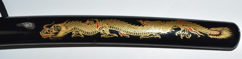 Japanese Wakizashi Samurai sword with dragon decoration to the tsuba, embossed kashira, menuki and fuchi, bound shagreen style handle and 46cm blade, in black lacquer scabbard decorated in gilt with a dragon. PLEASE NOTE ALL BLADED ITEMS ARE SUBJECT TO OVER 18 CHECK ON COLLECTION OR DELIVERY