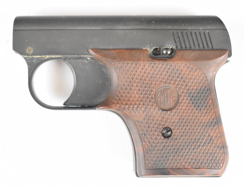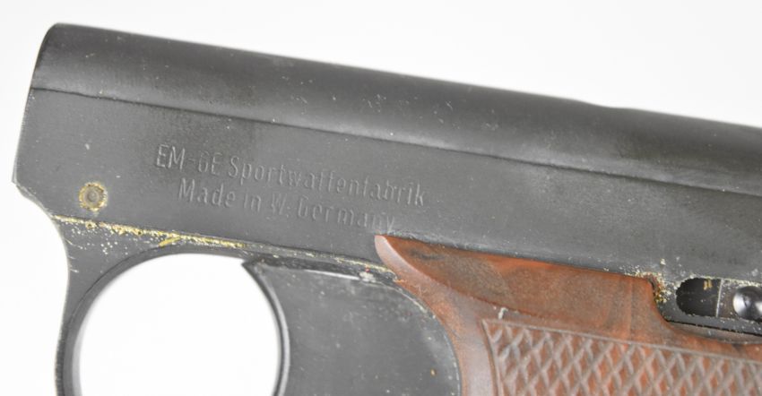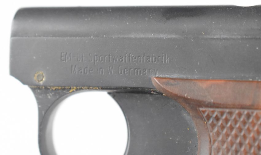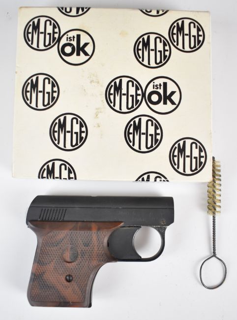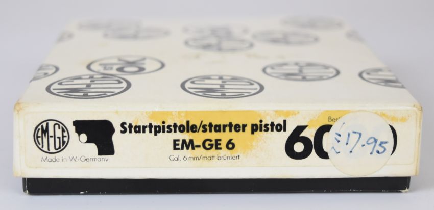 EM-GE German blank firing starting pistol with chequered composite grips embossed with logo, overall length 12cm, NVSN, in original box.