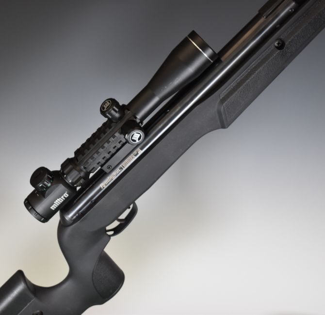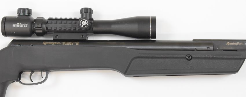 Remington Thunder Ceptor LT .177 air rifle with composite stock, textured semi-pistol grip, adjustable comb, Milbro Clearview 3-9x40 EG scope and sound moderated barrel, serial number 072105992.