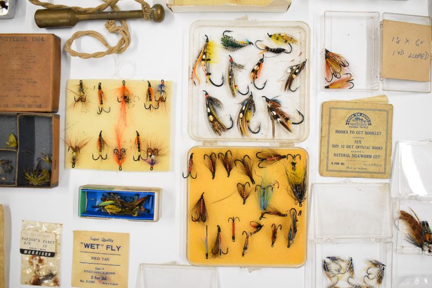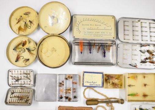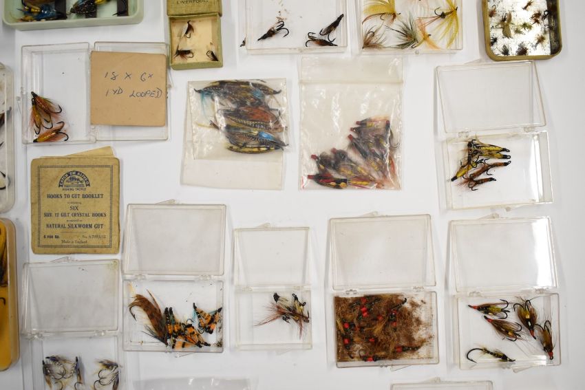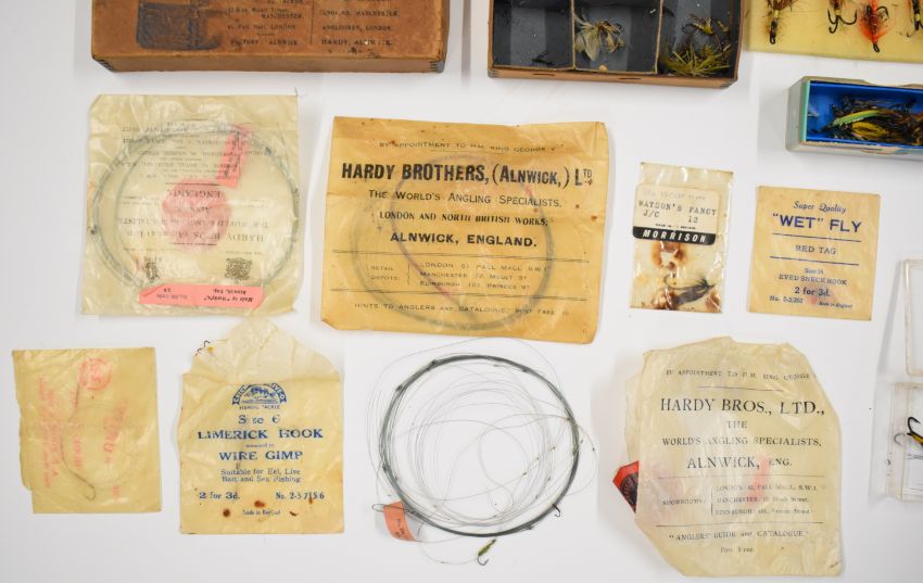 A large collection of vintage salmon, sea trout and trout fishing flies and accessories, many in original Hardy Bros boxes and packaging including mayflies, 'Small Loch Ordie Flies', box with 'The Halford Patterns', sectional cast tin with flies, several Wheatley fly boxes including Kilroy Pattern, double and treble hook patterns, a few flies with gut eyes, silkworm gut hooks etc etc