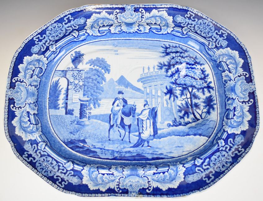 19thC transfer printed blue and white large meat platter with well, decorated with Chinese lady leading a mounted nobleman / royal, 52 x 41cm