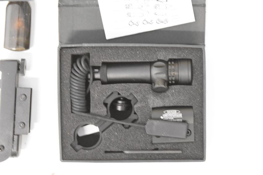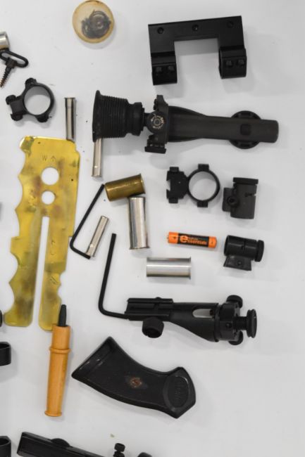 A collection of gun and rifle sights, parts and accessories including PAO Airgunner's Laser Sight in original box, target rifle sights, scope mounts, Diamond 14-45x50 Zoom spotting scope, horn handled chamber brush, Webley revolver grips, The Parker-Hale Instruction Manual on Service Rifles, snapcaps, shotgun chokes etc.