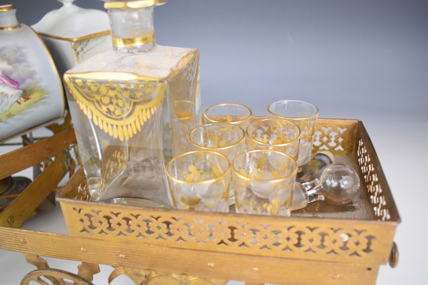 J B Toselli 19thC porcelain cafetiére in the form of a steam locomotive decorated with Watteau scenes, with tender, associated decanter and glasses, height 35cm, length (both carriages) 62m