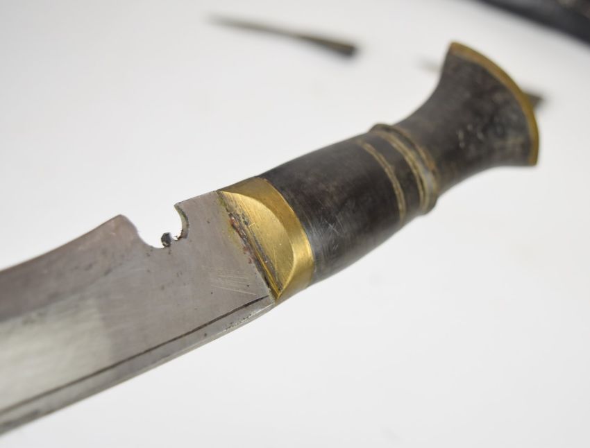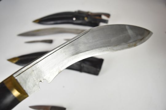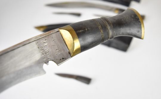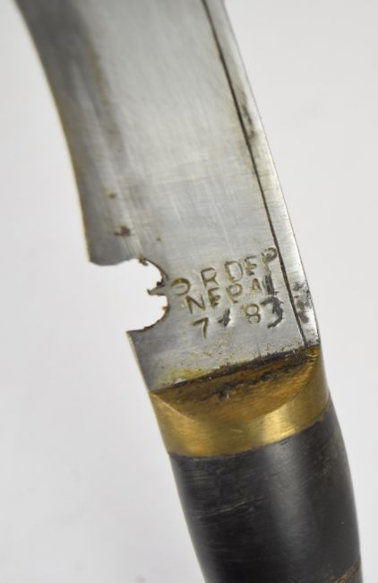 Two kukri knives both with 27.5cm blades stamped Ord Dep Nepal, one 10/83 the other 7/83, with kardas and chakmaks and leather scabbards. PLEASE NOTE ALL BLADED ITEMS ARE SUBJECT TO OVER 18 CHECK ON COLLECTION OR DELIVERY