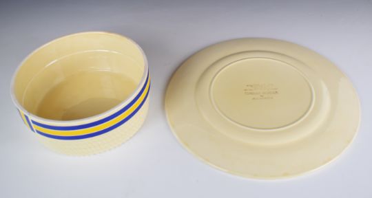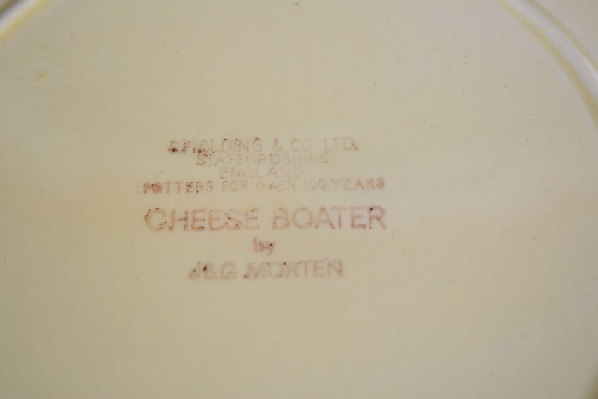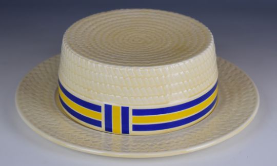 A and G Morten for Fieldings and Co 'Cheese Boater' novelty cheese dish in the shape of a hat with blue and yellow ribbon decoration, diameter 27 x height 8.5cm