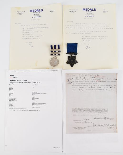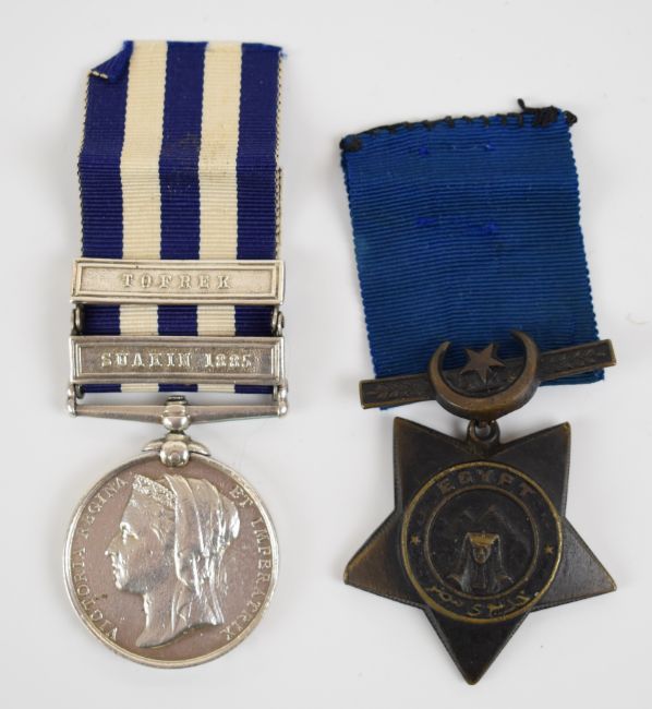 Royal Marines Egypt Medal with clasps for Suakin 1885 and Tofrek, named to Cpl C H Kybett, R.M.L.I. and Khedive's Star (undated). Charles Henry Kybett was born in Rochester, Kent in 1867 and enlisted in the Royal Marine Light Infantry January 1880. Shown as 'Royal Marine Battalion Egypt' for Suakin. He was discharged 1901 and applied to be a Subordinate Officer, Prisons Department, England June 1901, serving at Parkshurst Prison 1902-1907. He died on the Isle of Wight 1908.