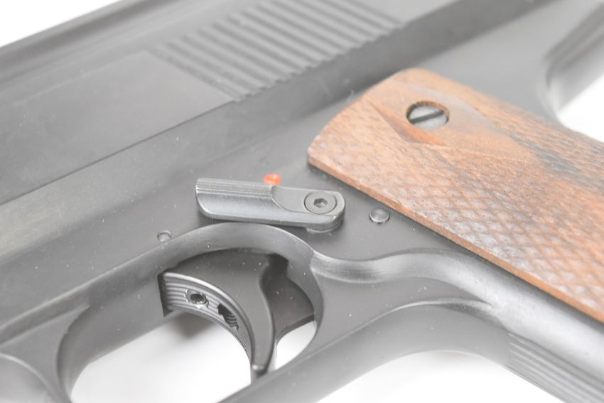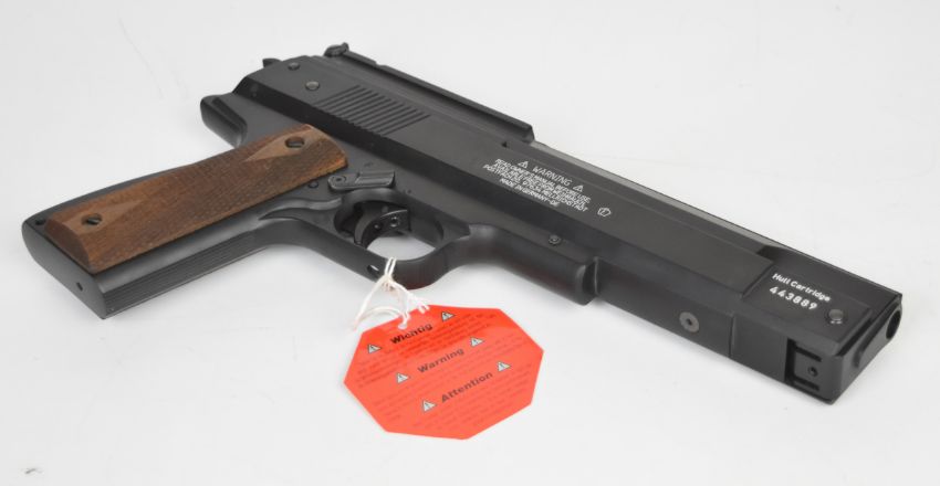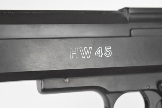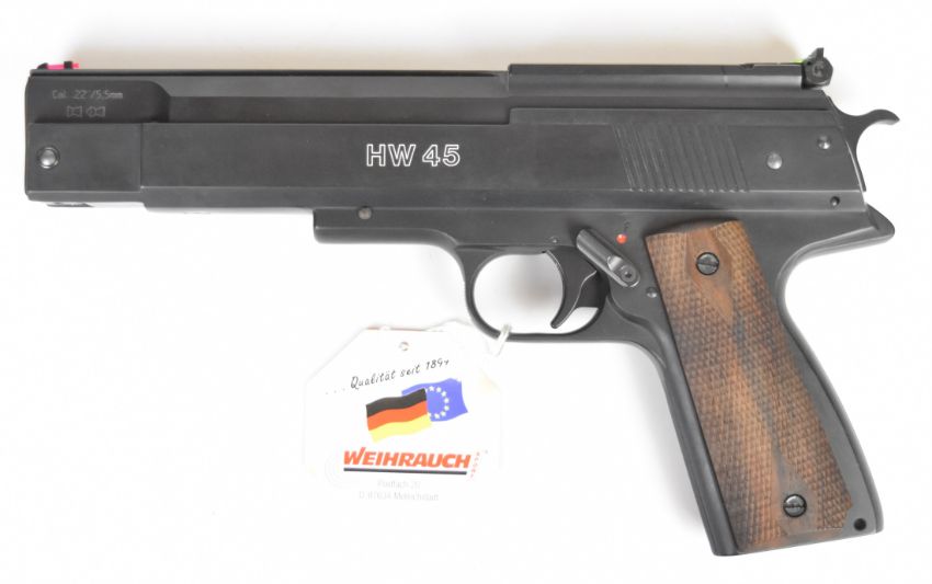 Weihrauch HW45 .22 air pistol with chequered wooden grips and adjustable sights and trigger, serial number 443889, with original tag.