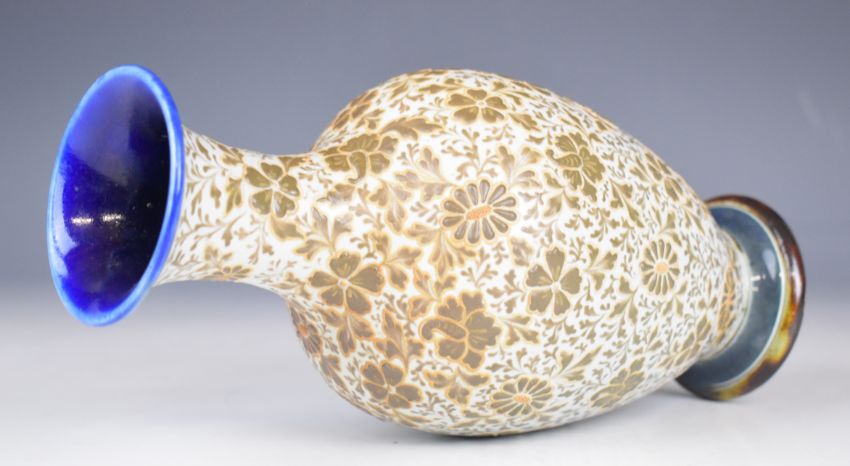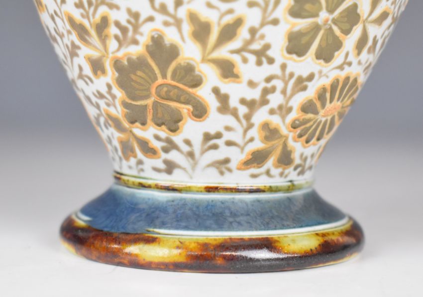 Royal Doulton pedestal vase with flower decoration in relief, signed Eliza Simmance with monogram to base, height 24cm