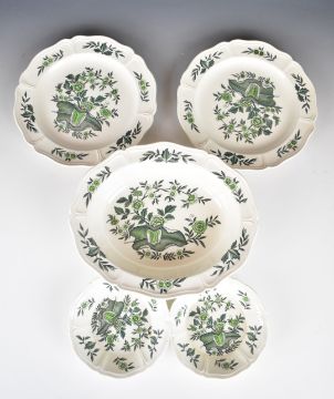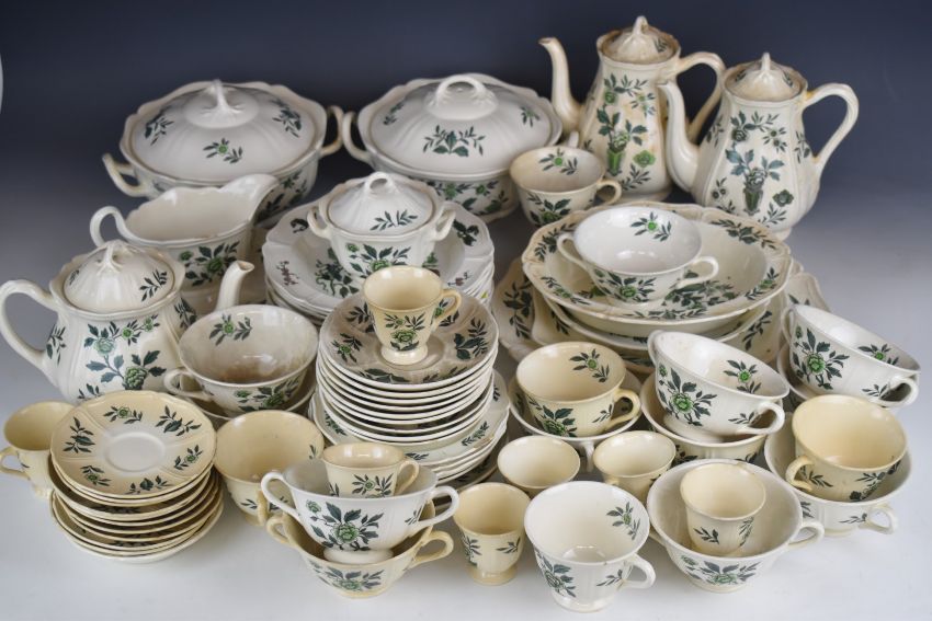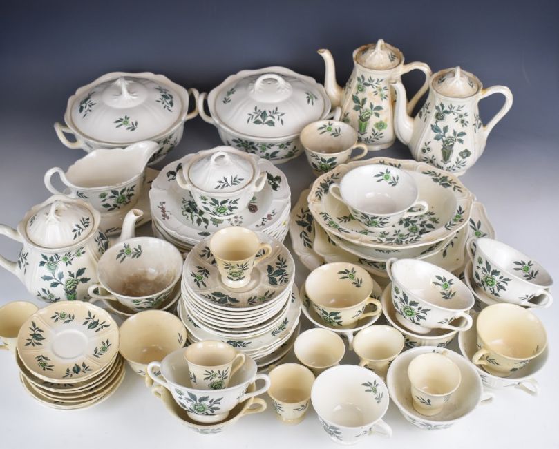 A large quantity of Wedgwood dinner and tea ware decorated in the Green Leaf and Mandarin patterns, including two twin handled tureens, two teapots etc., approximately 75 pieces, tallest 28cm