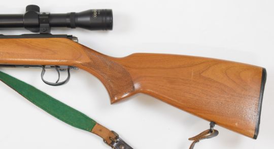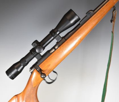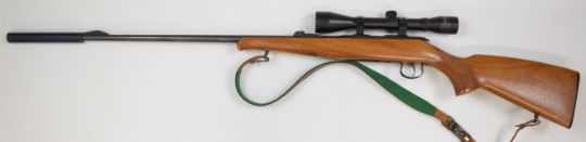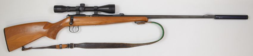 BRNO Model 2-E-H .22 bolt-action rifle with chequered semi-pistol grip and forend, leather sling, Richter Optik 4x40 scope, sound moderator and 31.5 inch barrel, overall length 125cm, serial number 475464. PLEASE NOTE THAT A VALID RELEVANT FIREARMS/SHOTGUN CERTIFICATE IS REQUIRED TO HANDLE/PURCHASE THIS ITEM.