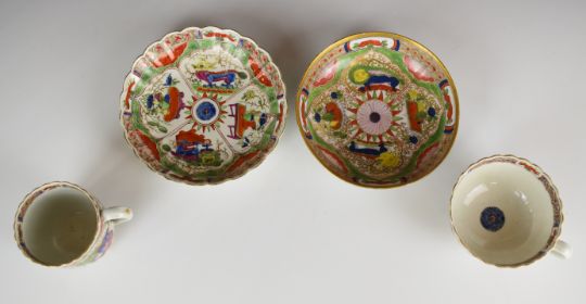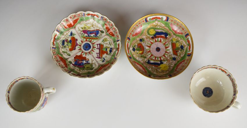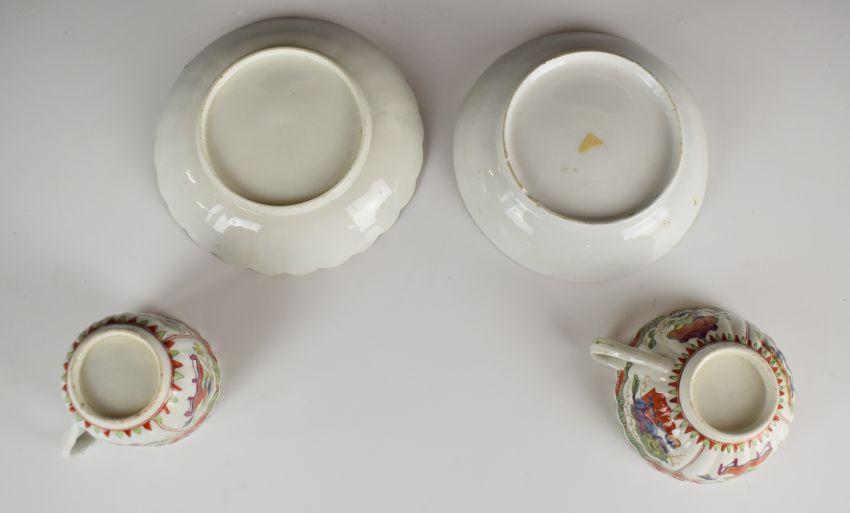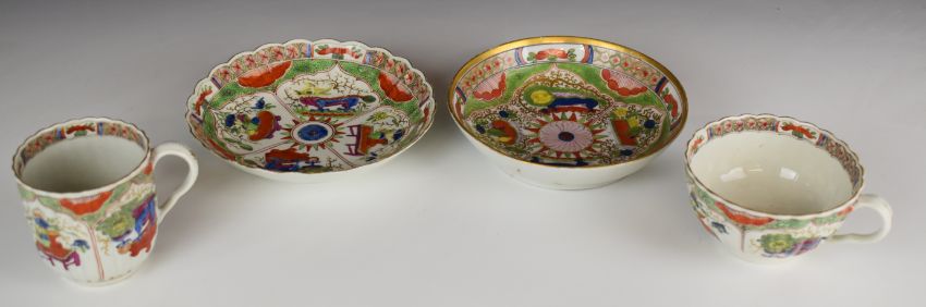 First period Worcester cup, coffee can and two saucers decorated with dragons in compartments, tallest 6.5cm