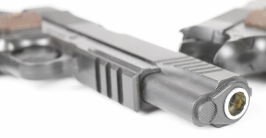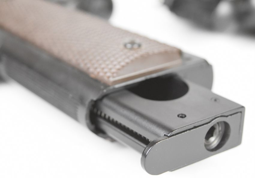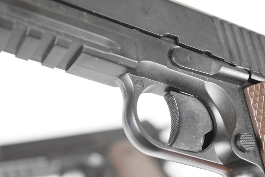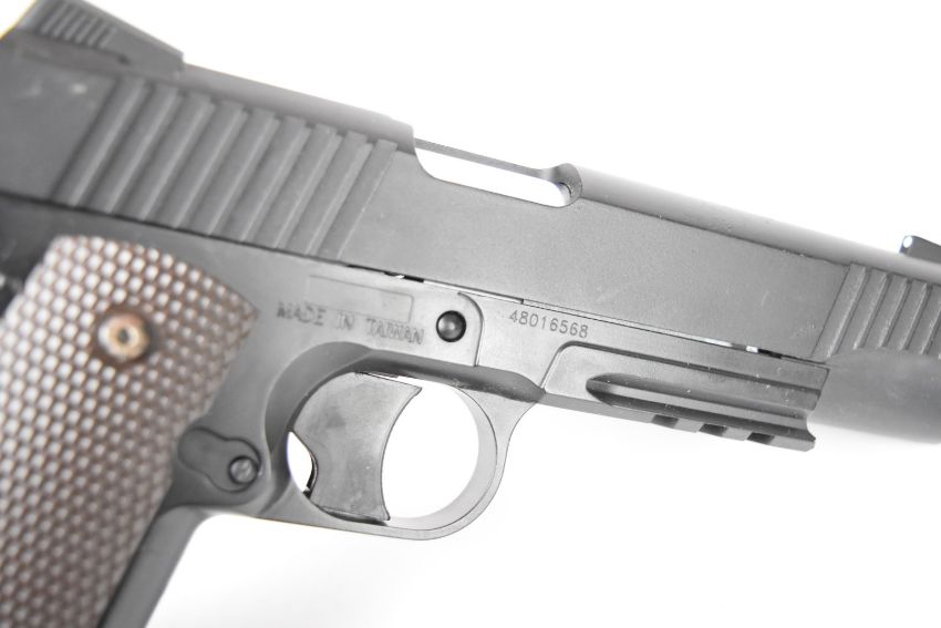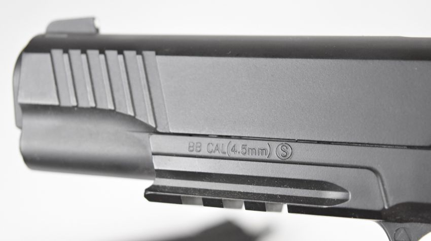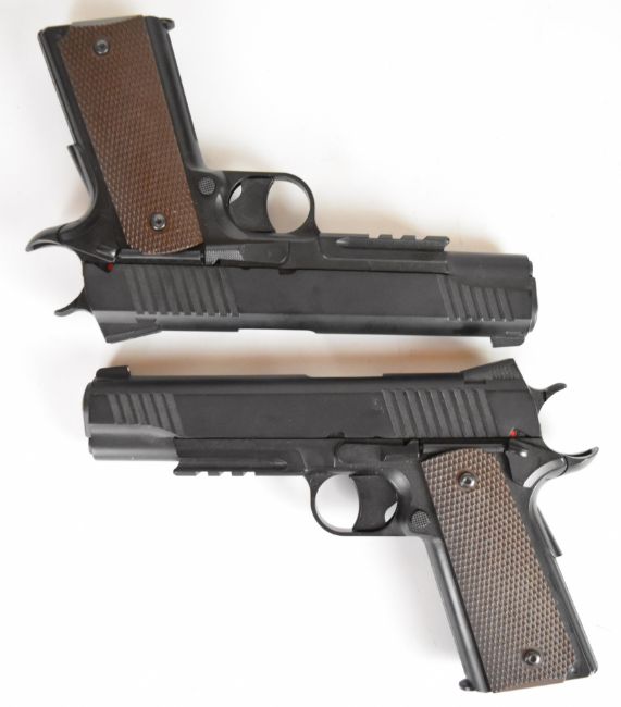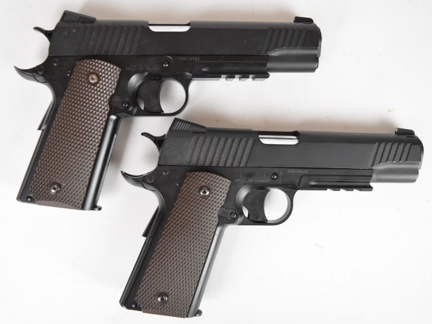 A pair of KWC M45 A1 .177 COair pistols each with chequered grips and 21 shot magazine, serial numbers 48016568 and 48016626.