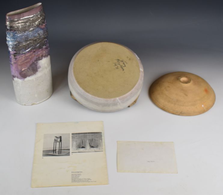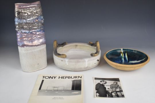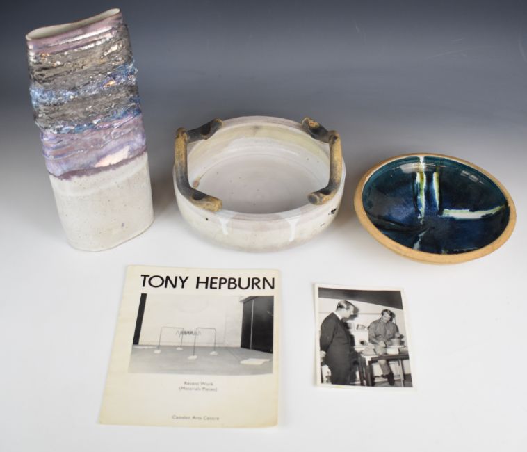 Tony Hepburn (1943-2015) twin handled stoneware bowl signed to base and dated 1971, pedestal dish with AH monogram and a tapered vase with lustre decoration, unsigned but all consigned by the executors of Hepburn's ex wife's estate, tallest 33cm, together with Camden Arts Centre Tony Hepburn brochure