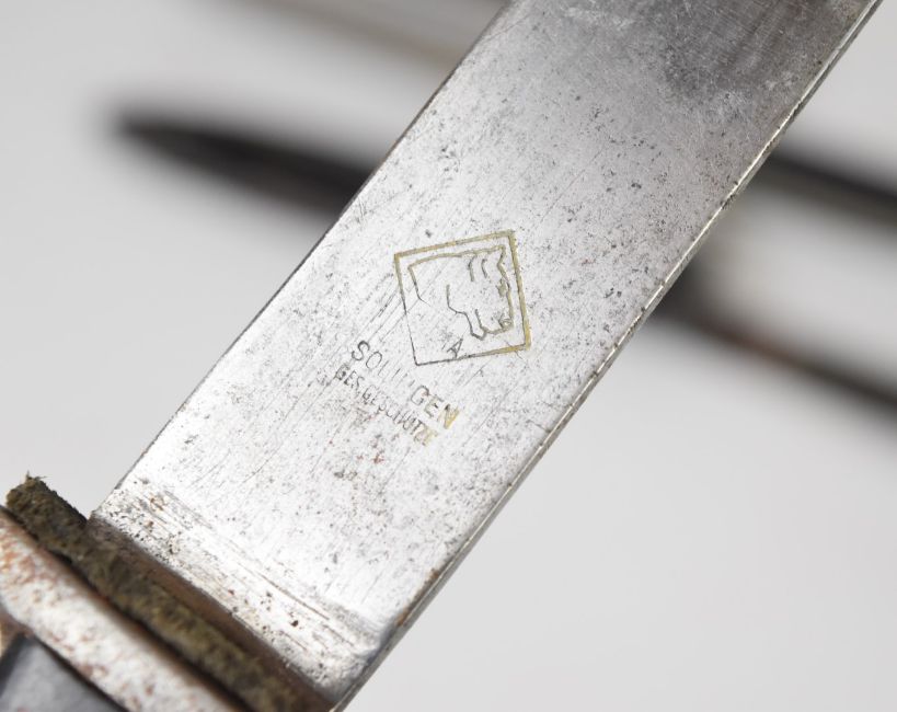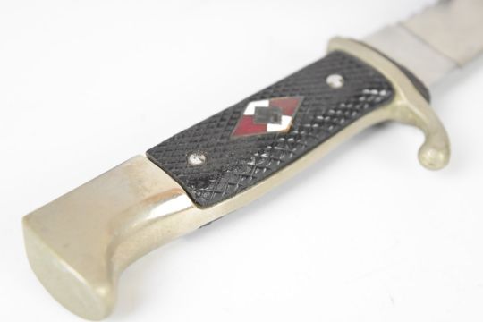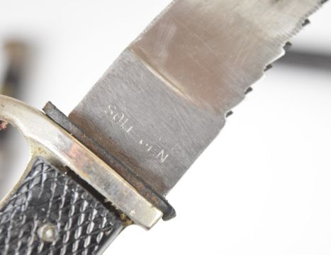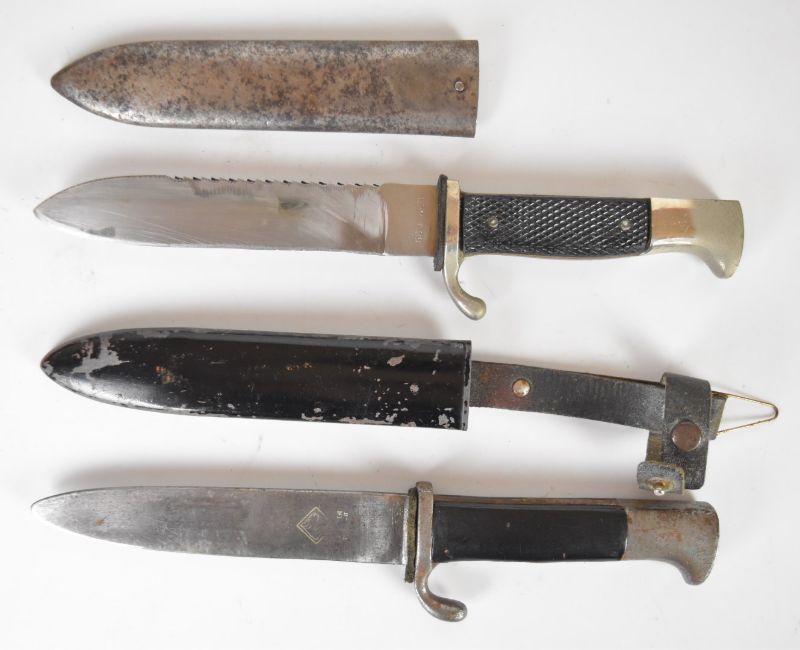 Two Hitler Youth style daggers one with 14cm serrated blade, marked Solingen to blade, the other with Puma maker's mark and Solingen GES Geschutzt to 13cm blade, both with scabbards. PLEASE NOTE ALL BLADED ITEMS ARE SUBJECT TO OVER 18 CHECK ON COLLECTION OR DELIVERY