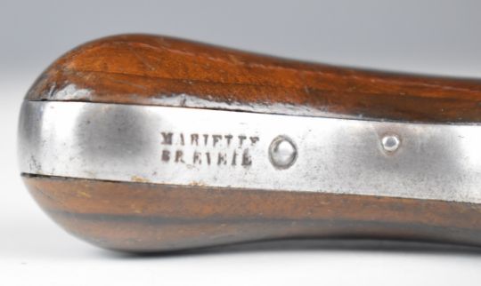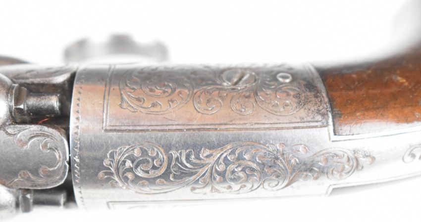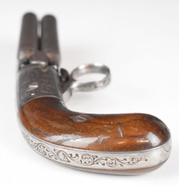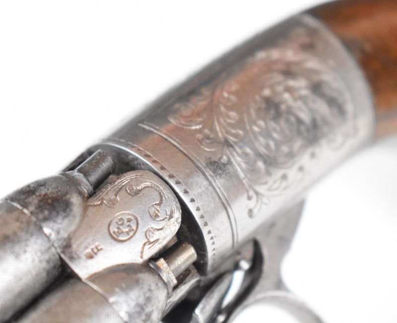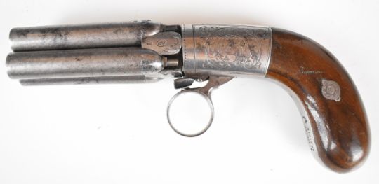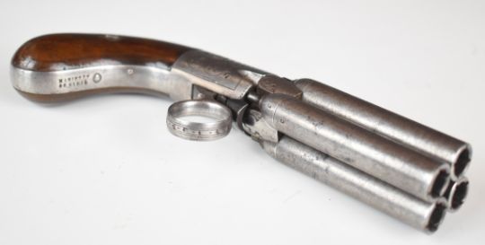 Belgian Mariette 120 bore four barrel under-hammer pepperbox revolver/ pistol with engraved locks, top strap and ring trigger, wooden grip and 3 inch turn-off Damascus barrels, overall length 18.5cm.