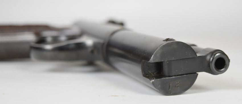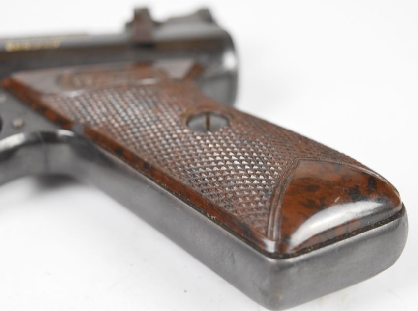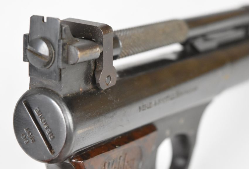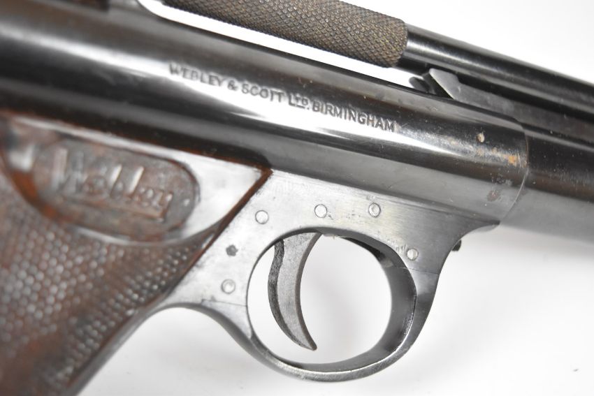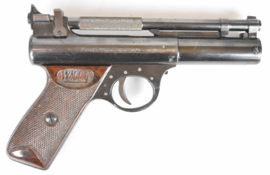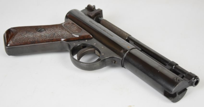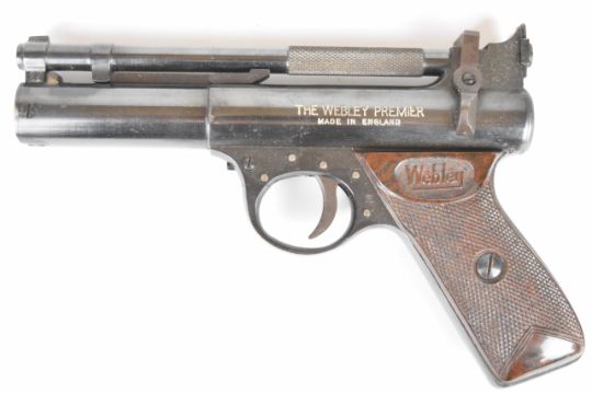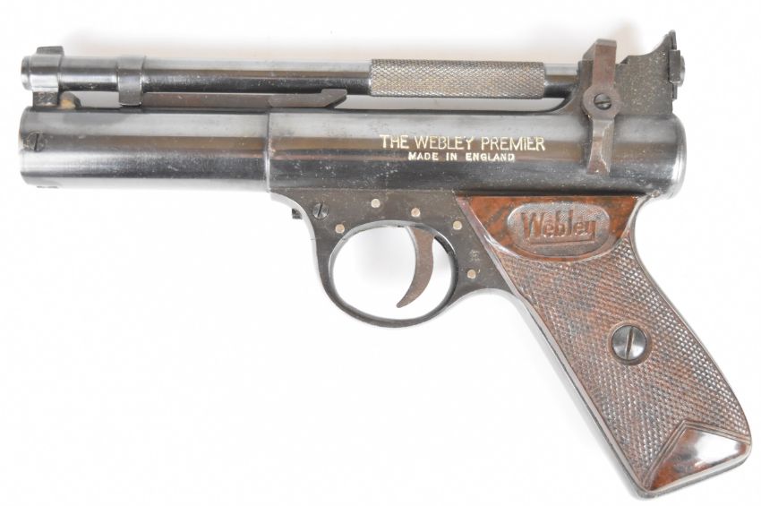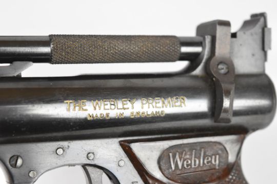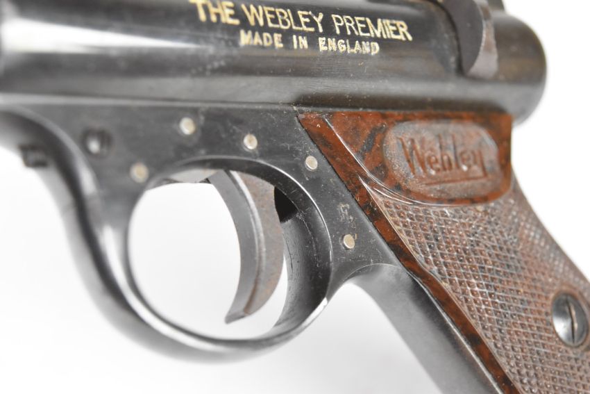Webley Premier .22 air pistol with named and chequered Bakelite grips and adjustable sights, serial number 12, in original box with Webley Air Pistol & Air Rifle Pellets packet and 'Component Parts of Mark I, Senior and Premier Webley Air Pistols' sheet.