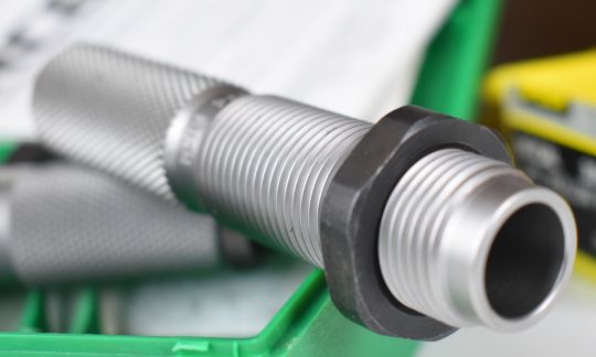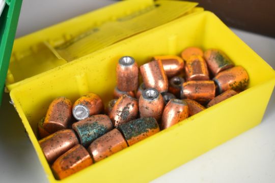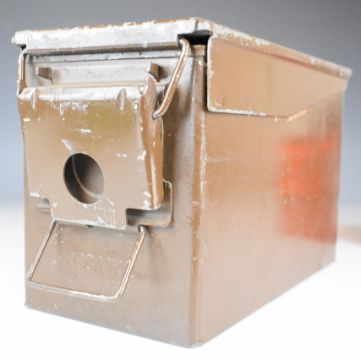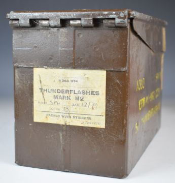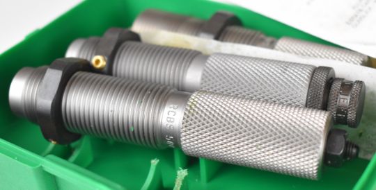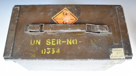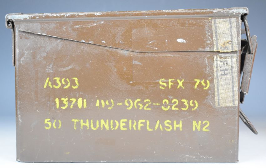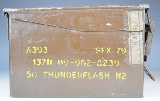 A collection of large calibre cartridge re-loading dies and bullet including .50 cal, .584, .500 and .510, in a military Thunder Flash ammunition box.
