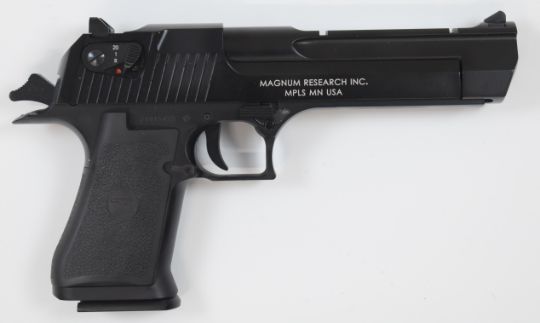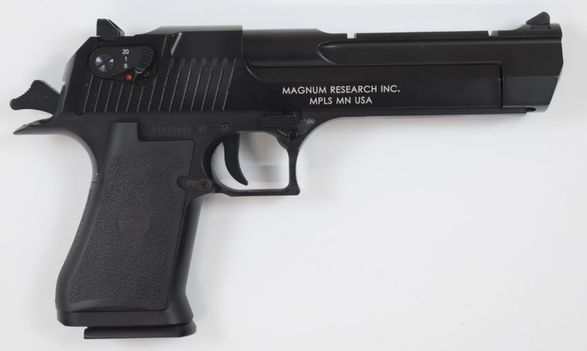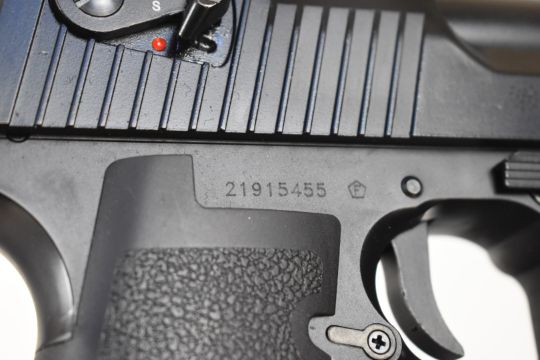 Cybergun Magnum Research Desert Eagle 6mm COairsoft pistol with textured grips, multi-shot magazine and fixed sights, serial number 21915455, in original box with instructions and accessories.