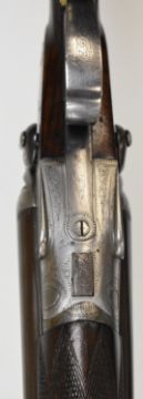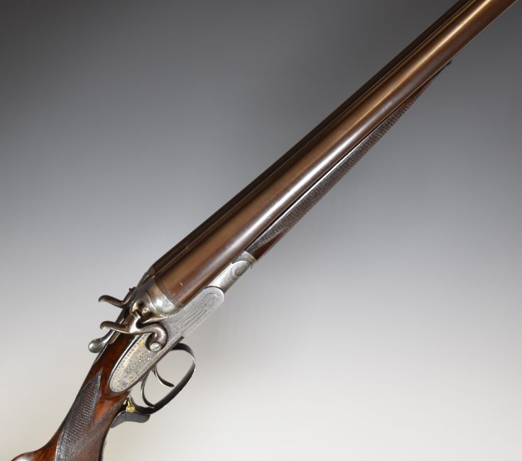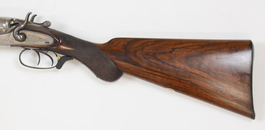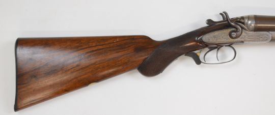 E Anson & Co 12 bore side by side hammer action shotgun with engraved scenes of birds to the named locks, engraved hammers, trigger guard, top plate, thumb lever and fences, chequered semi-pistol grip and forend, engraved cartouche to the underside of the stock, double trigger and named 30 inch Damascus barrels choked ½ and ¾, overall length 118cm, length of pull 35.5cm, serial number 12041. PLEASE NOTE THAT A VALID RELEVANT FIREARMS/SHOTGUN CERTIFICATE IS REQUIRED TO HANDLE/PURCHASE THIS ITEM.