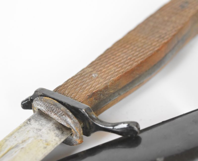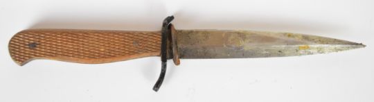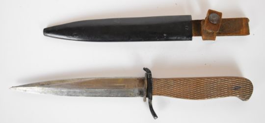 Possible WW1/WW2 fighting knife with chequered wooden grips, 14.5cm blade and metal scabbard. PLEASE NOTE ALL BLADED ITEMS ARE SUBJECT TO OVER 18 CHECK ON COLLECTION OR DELIVERY