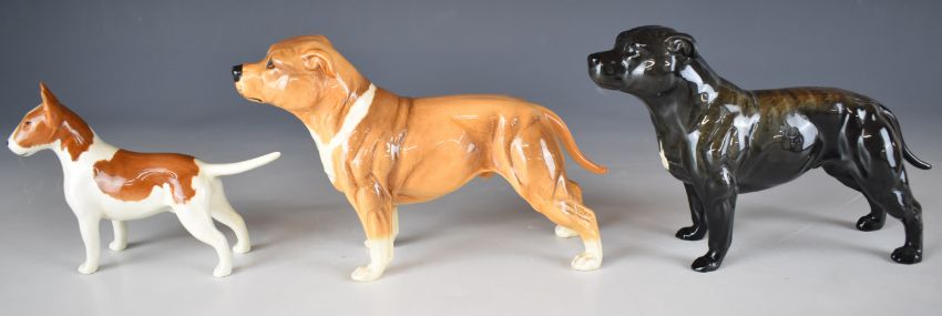 Two Beswick Staffordshire bull terriers and an English bull terrier includes Bandits Brintiga, tallest 11cm