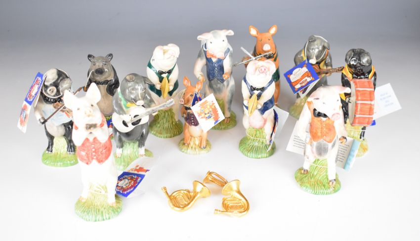 Twelve Beswick novelty pig band figures from the Pig Promenade series, includes three John Sinclair limited editions and Beswick centenary backstamps, most with original labels, tallest 14cm