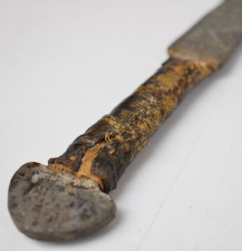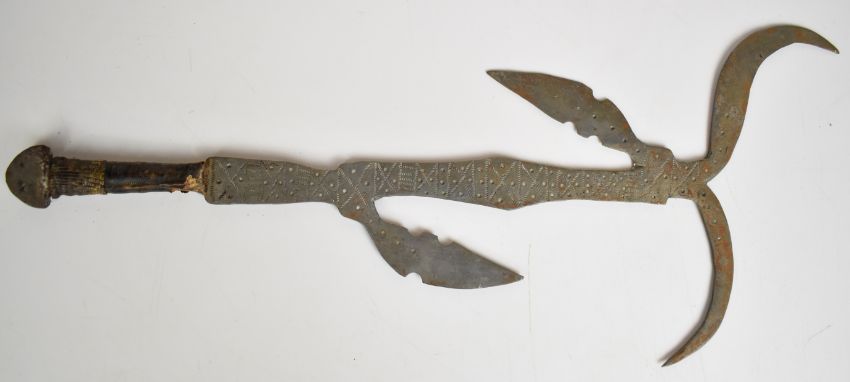 African throwing knife with skin covered grip, crudely decorated blades, overall length 45cm. PLEASE NOTE ALL BLADED ITEMS ARE SUBJECT TO OVER 18 CHECK ON COLLECTION OR DELIVERY