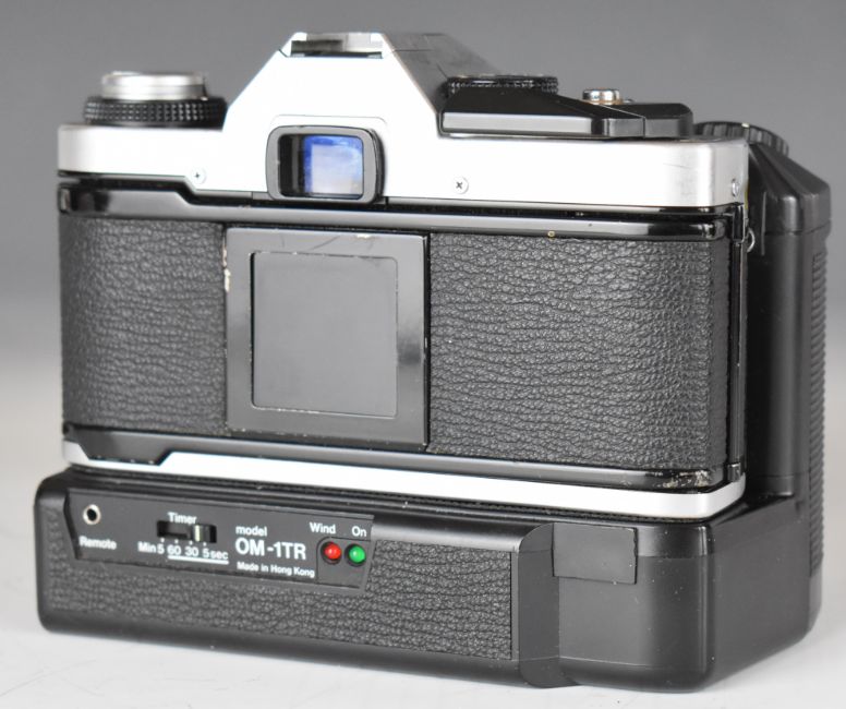 Olympus OM20 35mm SLR camera outfit including S Zukio 35-70mm 1:3.5-4.8, Zukio MC 1:1.8 f=50mm and Tamron 1:3.5-4.5 35-70mm lenses and Jessop auto winder