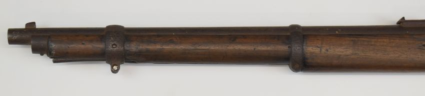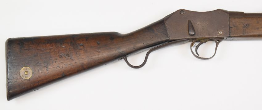 Enfield Martini-Henry Mark II .577/450 2-band carbine rifle with lock stamped 'VR Enfield 1872 II', pop-up ladder sights, brass plaque inset to the stock stamped ' R.I.C. 6810', steel ram-rod and 21.5 inch riffled barrel, overall length 96cm.