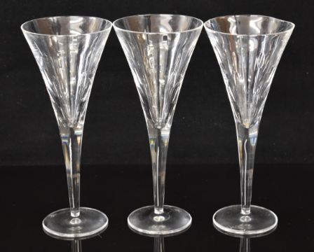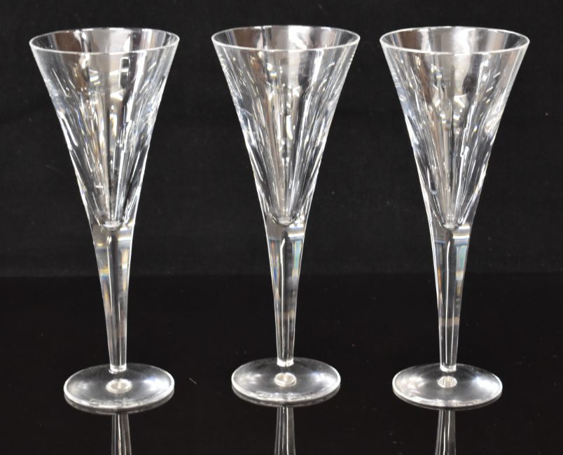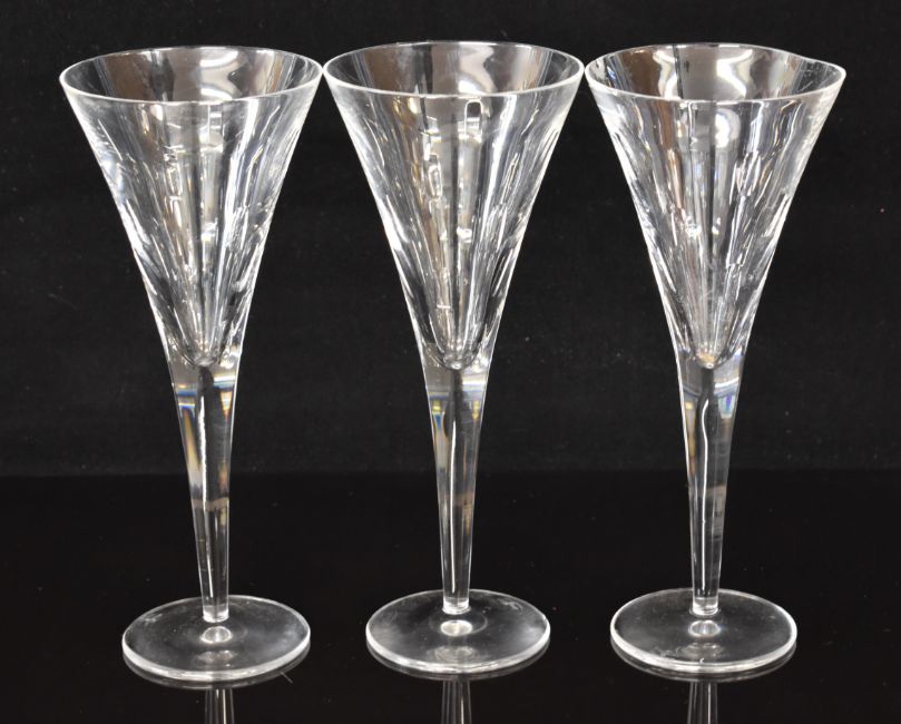 John Rocha for Waterford Crystal eight clear cut glass champagne flutes or wine glasses, five 25cm tall and three 24cm tall.