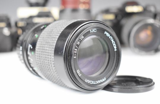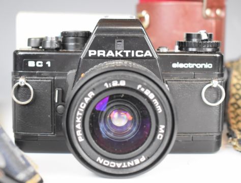 Three 35mm SLR cameras comprising Minolta X-500 with Minolta MD 50mm 1:1.7 and Super Paragon 28-100mm lenses and Praktica BC and B100 with 28mm 1:2.8, 3.5-4.5/35-70, 2.8-4/35-70mm, 4-5.6/70-210 and Carl Zeiss Jena 70-210mm 1:4.5-5.6 lenses