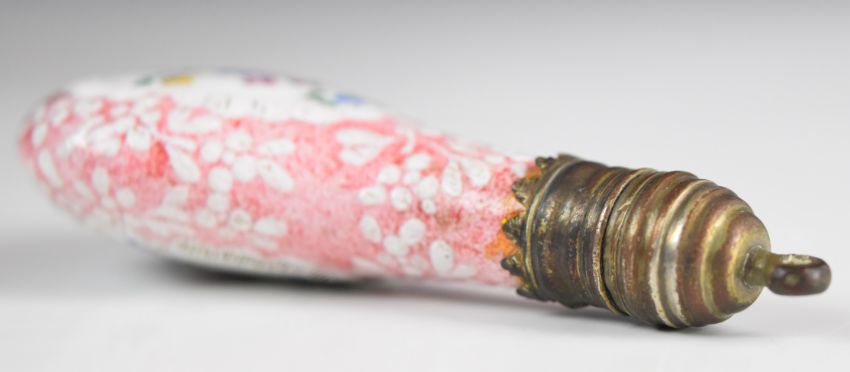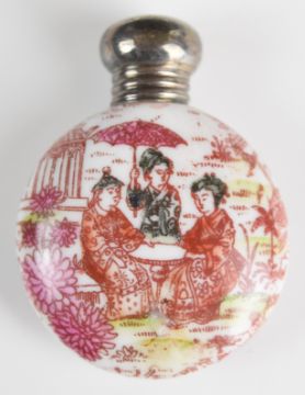 Three 19thC porcelain and enamel scent / perfume bottles, two with hallmarked silver mounts including 'St Michaels Church, Beer', tallest 7.5cm