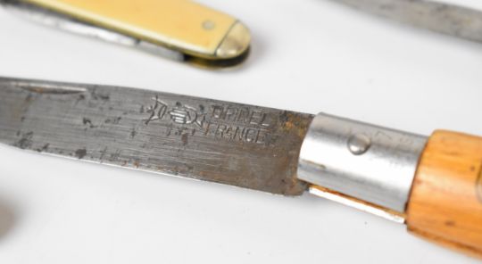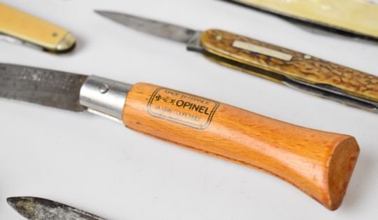 Eight pocket / folding knives including Opinel, Taylors Eye Witness and Redge, together with a Wilkinson Sword pruning knife, longest blade 7cm (9). PLEASE NOTE ALL BLADED ITEMS ARE SUBJECT TO OVER 18 CHECK ON COLLECTION OR DELIVERY
