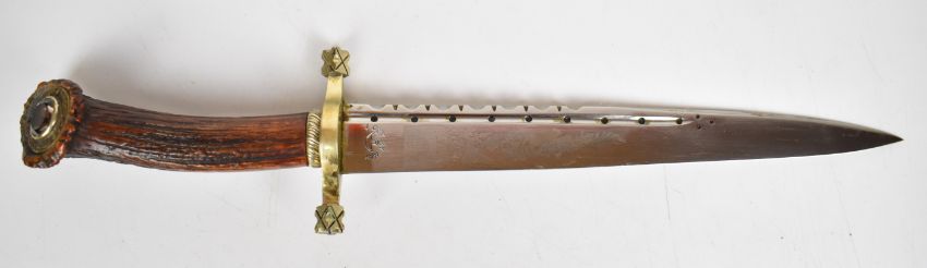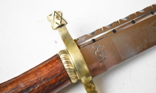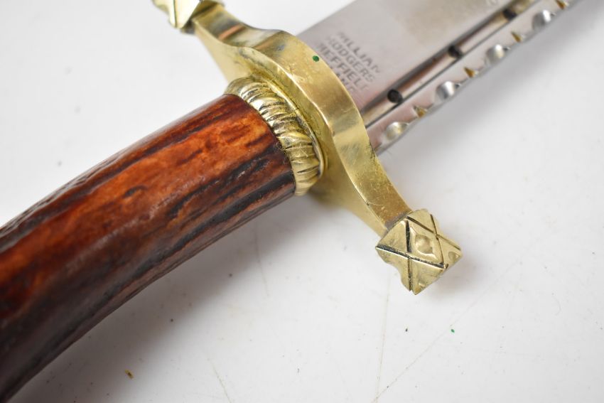 William Rodgers Scottish dirk with etched single edged 28cm blade, pommel set with Cairngorm type stone, stag horn grip and sheath. PLEASE NOTE ALL BLADED ITEMS ARE SUBJECT TO OVER 18 CHECK ON COLLECTION OR DELIVERY