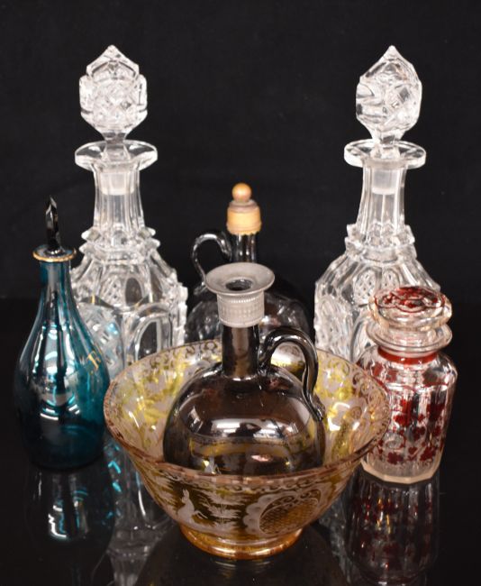 Seven pieces of Victorian and later glassware including a flash overlaid pedestal dish decorated with hares, amethyst glass decanters, green glass 'Rum' decanter, pair of large hobnail cut glass decanters etc, largest 35cm tall.