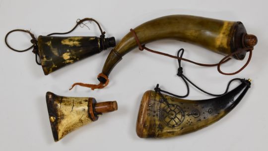 Four horn powder flasks with wooden fittings one with carved decoration, largest 30cm long.