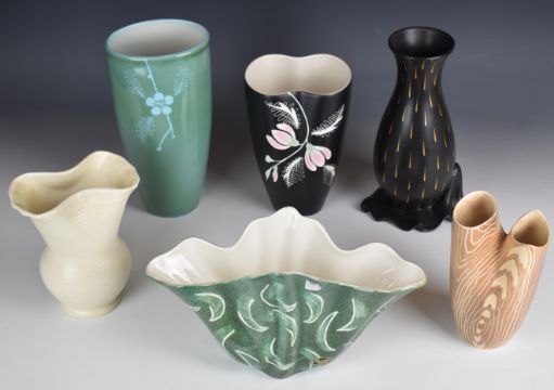 Beswick retro / mid century modern vases and jardinière including shape numbers 808 and 1343 with gold oval backstamp, 1457 etc, tallest 25.5cm