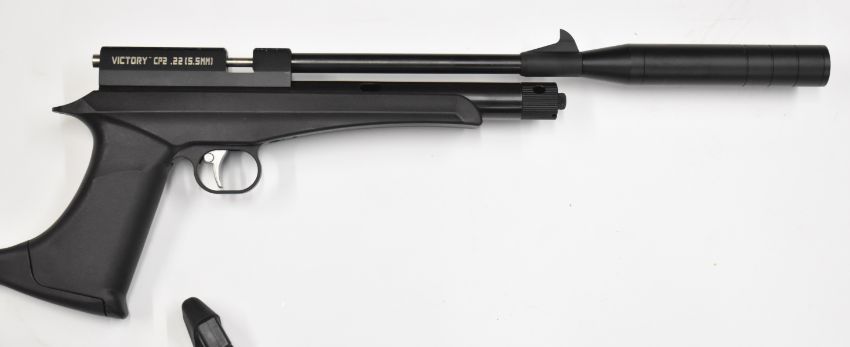 Victory CP2 .22 bolt-action CO2 air pistol or rifle with detachable composite skeleton stock, two barrels, three 7-shot magazines and interchangeable sights, serial number 17212199550588051, in original box with paperwork and accessories.