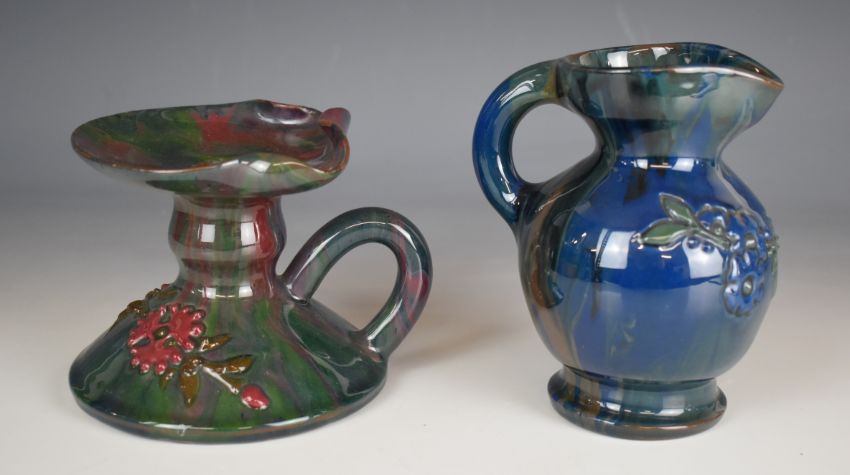 Elton Ware pottery chamberstick and jug with floral decoration in relief, Worlock Collection labels to base, tallest 13cm