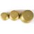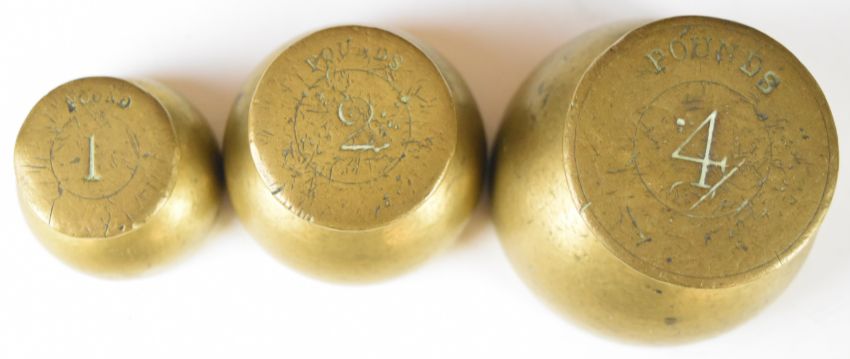 Four bun weights comprising a ceramic 4lb example and a run of three from 4 down to 1lb brass or bronze examples