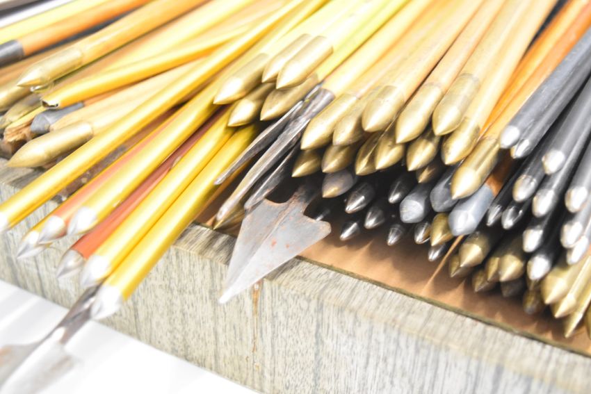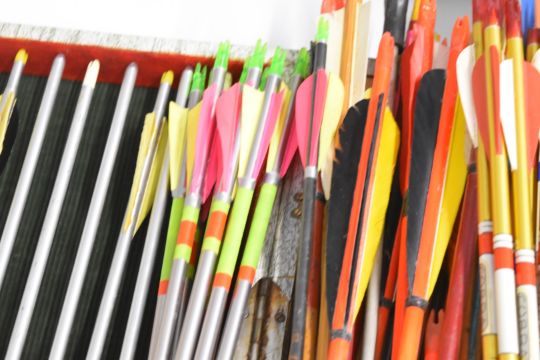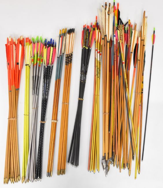 Over 100 archery arrows including aluminum and wooden examples, some in cases.