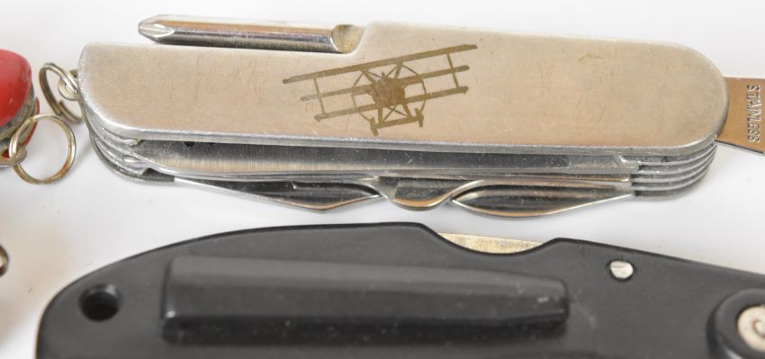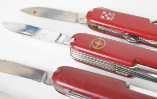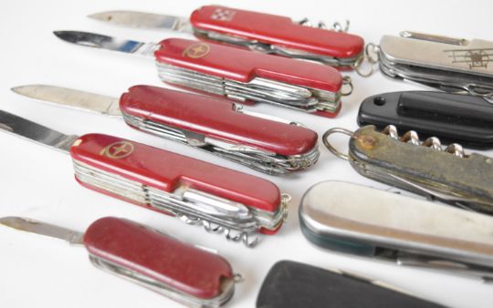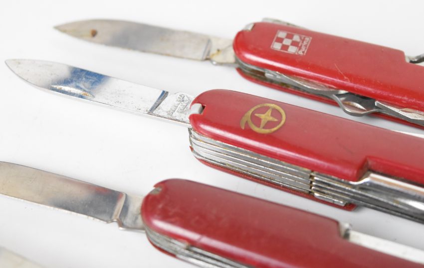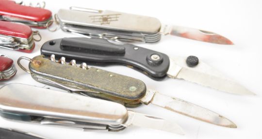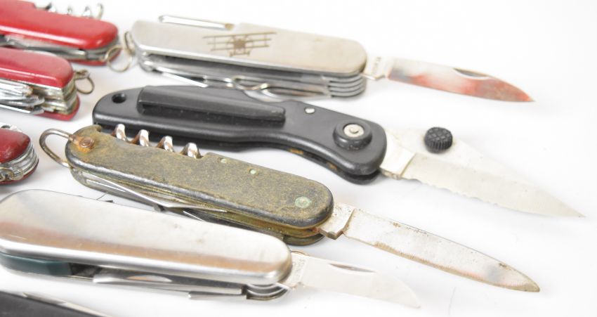 Ten pocket / folding knives including five 'Swiss Army' style examples, longest blade 6.5cm. PLEASE NOTE ALL BLADED ITEMS ARE SUBJECT TO OVER 18 CHECK ON COLLECTION OR DELIVERY