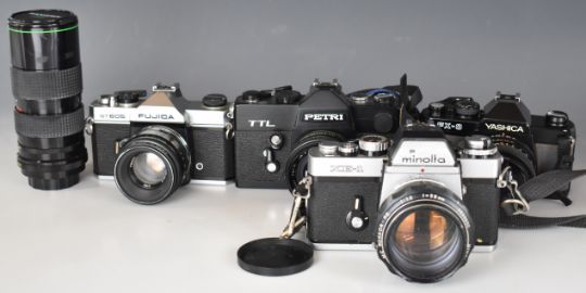 Four 35mm SLR cameras comprising Minolta XE-1 with Rokkor 1:1.2 f=58mm lens, Yashica FX-3 with 50mm 1:1.9 lens, Fujica ST605 with Helios 2/58 lens and Petri TTL with 1:1.8/55 and Hanimex 1:3.5 72-162mm lenses