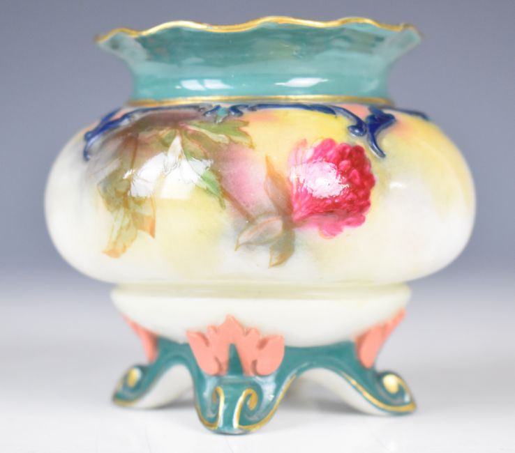 Royal Worcester Hadley Ware footed squat vase with frilled rim and flower decoration, height 7.5cm