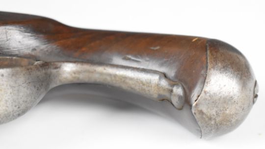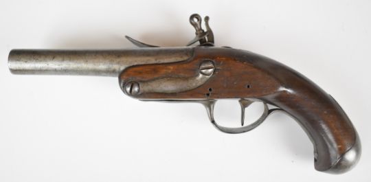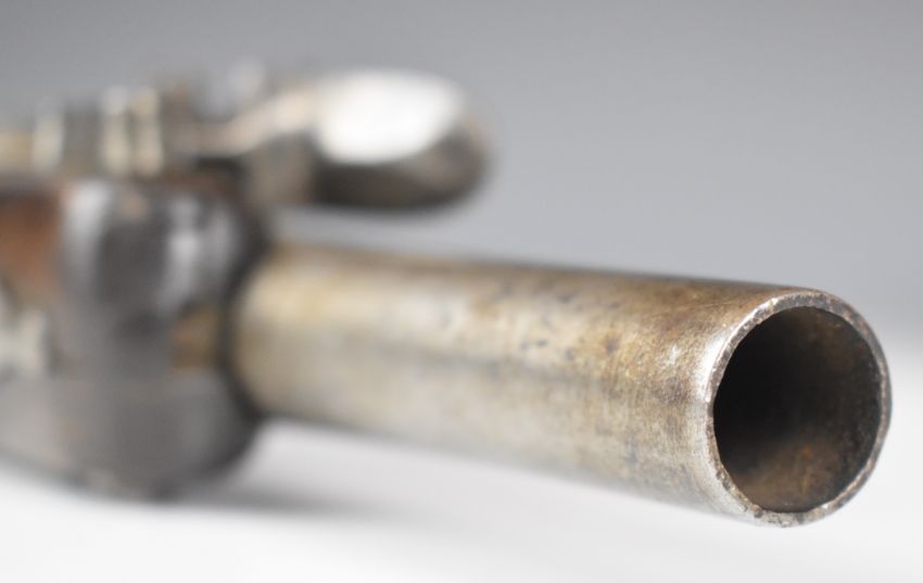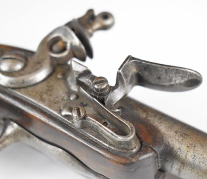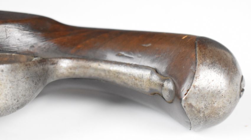 Queen Anne flintlock belt pistol with steel mounts and 5 inch smooth bored barrel, overall length 26cm.