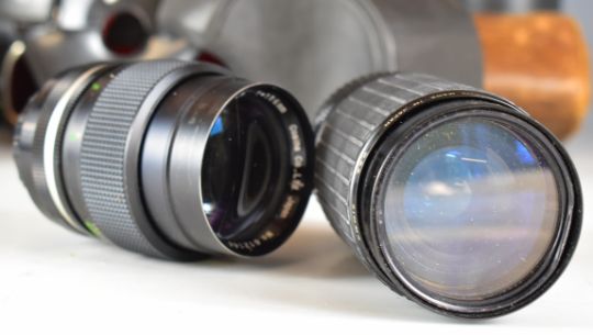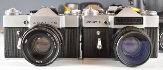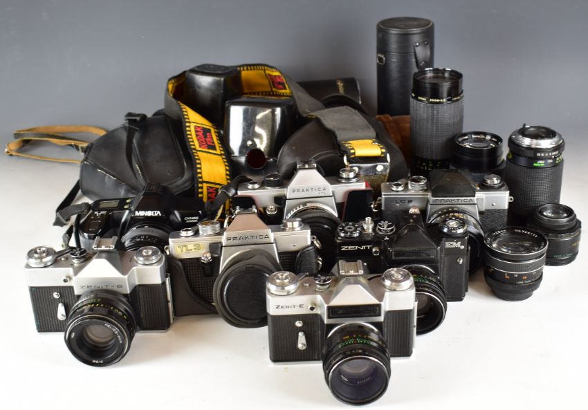 Seven 35mm SLR cameras comprising Praktica VLC2 with 35mm 1:2.8 lens, Praktica TL3 with Takumar 1:1.8/55 lens, Praktica LTL with Carl Zeiss Jena 1.8/50 lens, Minolta Dynax 3000i with Sigma 1:3.5-4.5 35-70mm lens, Zenit-E with Helios 2/58 lens, Zenit EM with Helios 2/58 lens and Zenit-B with Helios 2/58 lens and Sigma 1:4.5-5.6 75-300mm, Helios 2/58, Prinzflex 1:2.8 f=28mm and Cosinon f=2.8 f=135mm screw mount lenses and a Yashica mount Vivitar 70-105mm 1:3.8 lens
