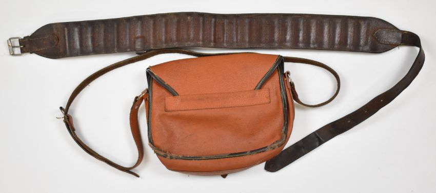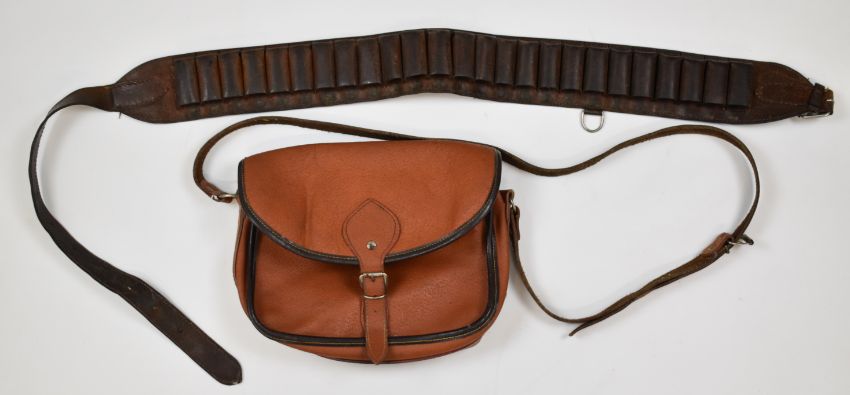 Two shotgun cartridge accessories comprising a leather cartridge bag and a 12 bore cartridge belt.
