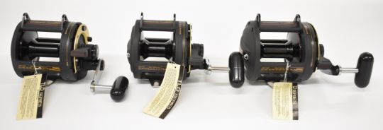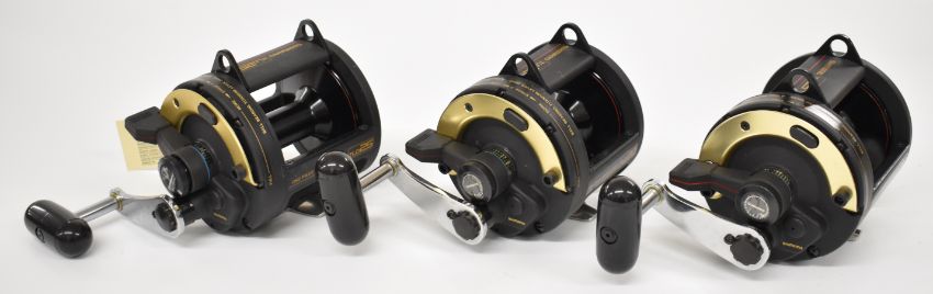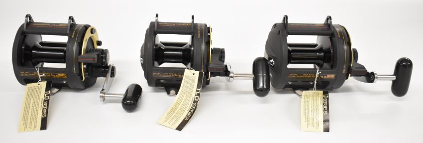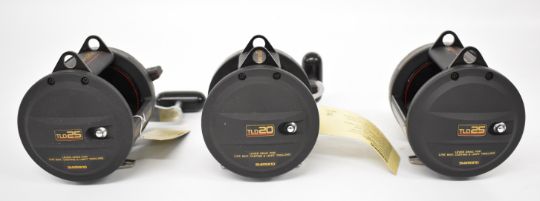Three Shimano TLD 25 multiplier fishing reels, all boxed with paperwork / accessories, all appear new / unused and have labels still attached