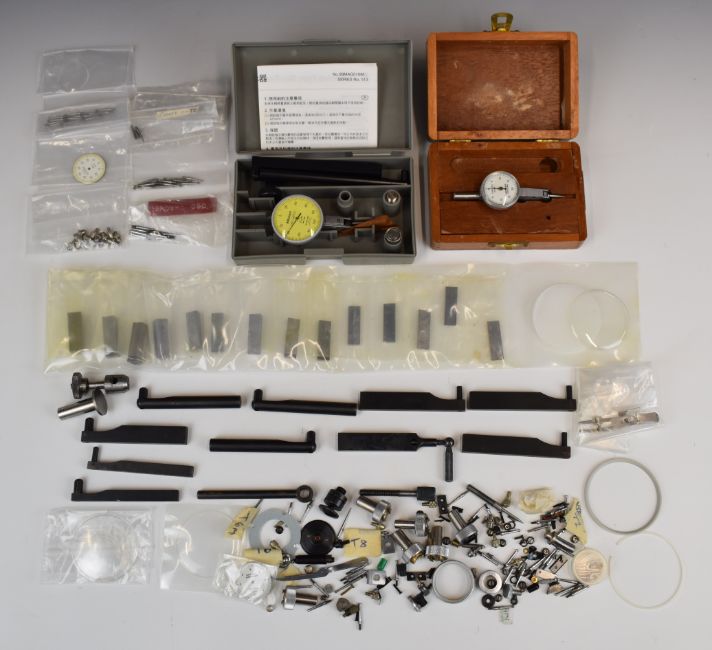 Mitutoyo dial test indicator, in original box, together with a Mercer example also in original box, box of DTI parts and slip gauges