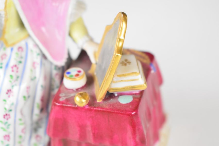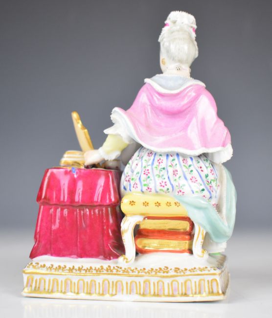 Meissen / Vienna porcelain figurine allegorical of vanity, seated lady with lace trimmed clothing holding a mirror, with blue crossed swords mark over impressed Vienna beehive mark, height 15cm